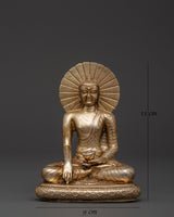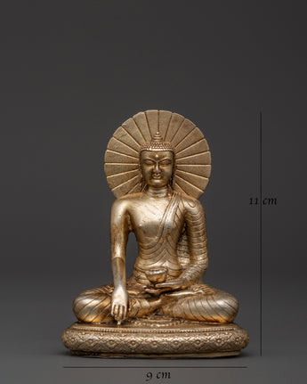 This silver-plated Shakyamuni Buddha statue, symbolizing tranquility and spiritual wisdom, is a polished work of sacred art suitable for personal altars and reflective spaces. The compact yet detailed sculpture, measuring 11cm in height and 9cm in breadth, depicts the historical Buddha in a meditative seated posture with the earth-touching mudra (Bhumisparsha).