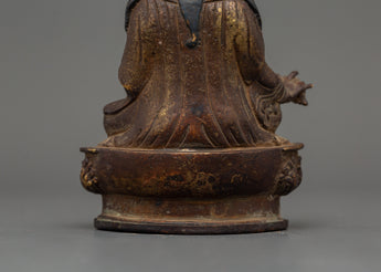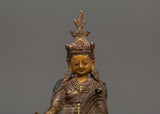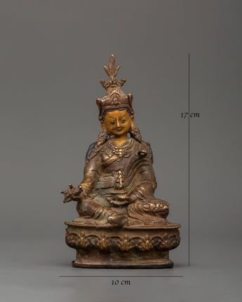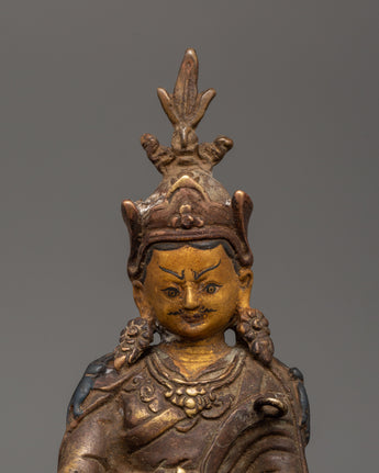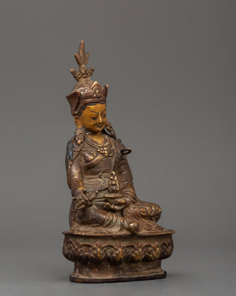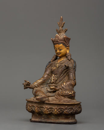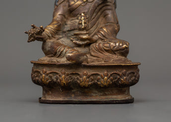 This antique-finished copper sculpture exemplifies the creativity and spiritual reverence inherent in traditional Tibetan handicraft. The weathered patina creates a realistic, time-worn appearance that evokes the mystical essence of Himalayan temples. Guru Rinpoche, the Lotus-Born Master, is a renowned tantric teacher who suppressed negative energies and brought Vajrayana Buddhism to Tibet. Placing this statue on your altar, meditation area, or spiritual corner brings blessings in wisdom, clarity, and healing energy. Whether you're a practitioner, spiritual seeker, or Buddhist art collector, this statue connects deeply to ancient teachings and a profound presence that exudes peace, strength, and sacred intention.