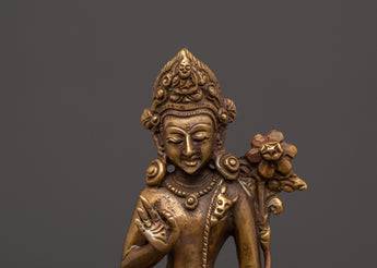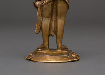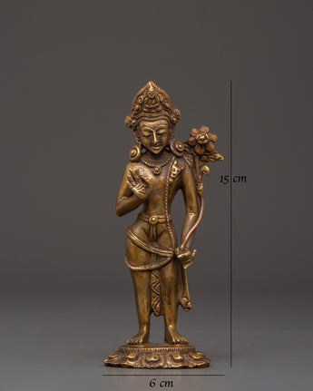 Bring compassion and peace into your home with the Standing Lokeshwor Statue, a masterfully carved portrayal of Avalokiteshvara, the Bodhisattva of Compassion. This beautiful sculpture, 15 cm tall and 6 cm wide, is skillfully carved from copper to capture Lokeshwor's tranquil and compassionate nature. This Buddhist deity sculpture, weighing around 0.35 kg, is suitable for practitioners and collectors, demonstrating traditional workmanship and creative elegance. This tiny and highly carved artwork is ideal for meditation areas, personal altars, or spiritual collections, as a symbolic reminder of compassion, wisdom, and the transformational power of mindfulness.