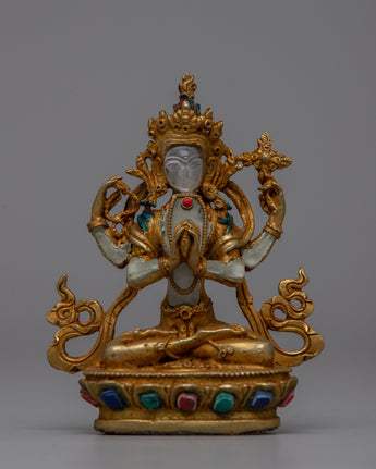 The Statue of Bodhisattva Set represents a deep spiritual tradition by combining revered characters from Tibetan Buddhism in a stunning ensemble. Each statue is delicately handcrafted on copper bodies and crystal stone, ensuring authenticity and reverence in every element of its construction. The electro-gold plating gives a bright touch, boosting the aesthetic appeal while representing the divine illumination and enlightenment connected with these spiritual creatures.