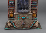 Our Statue is a hand-carved statue of Buddha that includes a beautiful stand that is filigree design. The product is decorated with various types of precious gemstones. The detailing of the statue is beautifully done to give it a perfect look.