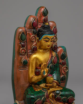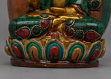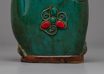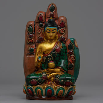 Crafted with precision and care, this brass sculpture captures the essence of Buddha Amogasiddhi in a state of serene meditation. The artificial gemstones, including turquoise, coral, and Blue Lapis, are meticulously inlaid to create a striking contrast against the brass body. Each gemstone symbolizes spiritual significance and adds a touch of opulence to this divine statue.