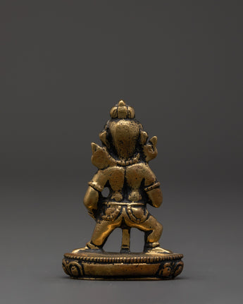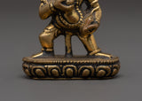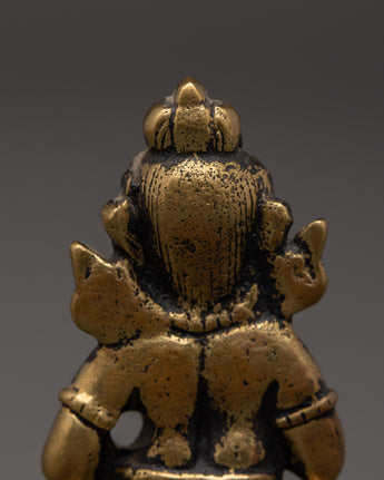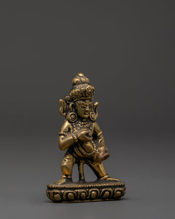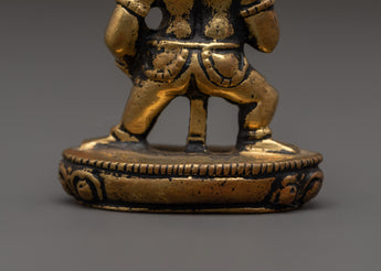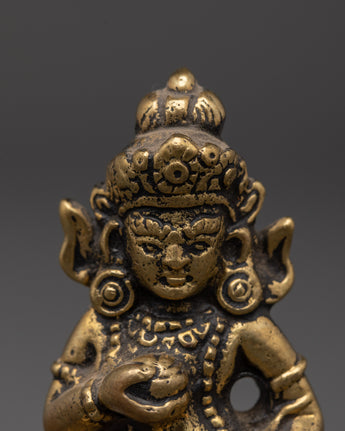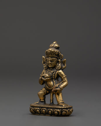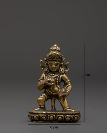 This handcrafted brass statue, measuring 7 cm in height and 5 cm in width, weighs approximately 0.14 kg and is ideal for altars, meditation areas, or other sacred spaces. Dzambhala's figure grips a mongoose as a symbol of wealth release. At the same time, his decorated crown and jewelry represent a divine reality, a sacred decision for individuals seeking not only worldly prosperity but also inner strength and spiritual security.