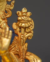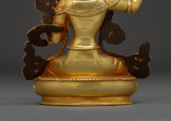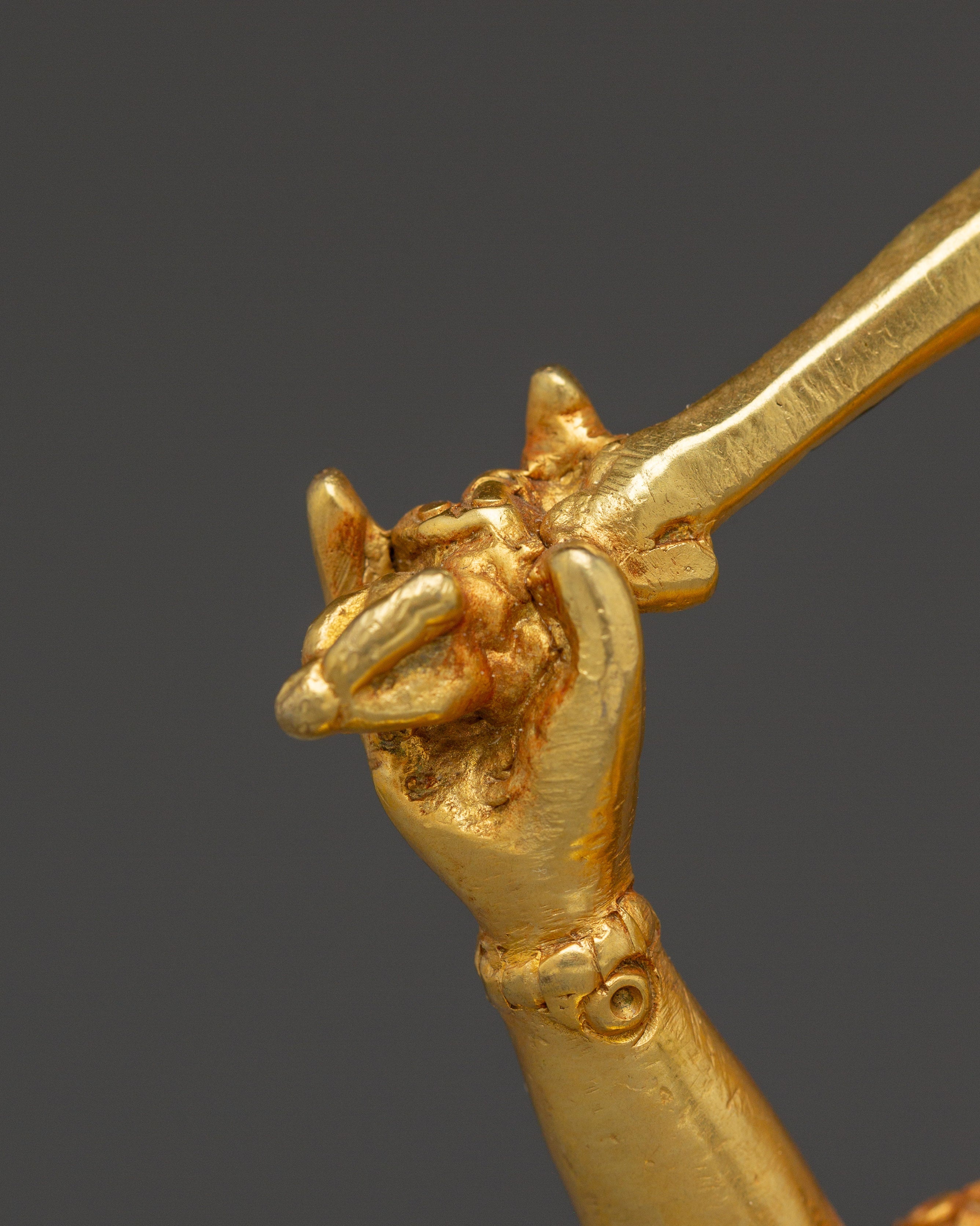 The Tibetan Deity of Manjushri is made from copper and beautifully adorned with 24K gold gilding and detailed gold and acrylic paintings. Measuring 5.5”/14cm in height and 4.1”/10.5cm at the base, it weighs 0.47 kg. This statue is a perfect addition to any altar, study space, or meditation area, inspiring clarity, insight, and enlightened thought.