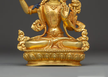 Manjushri, the revered Bodhisattva of Wisdom, is depicted seated gracefully on a throne that blends a lotus and a moon disc—symbols of purity, stability, and freedom from illusion. The lotus, rising from muddy waters, represents wisdom blossoming from ignorance, while the moon disc reflects the serene clarity of awakened insight. In his right hand, he wields a flaming sword that slices through delusion, unveiling the true nature of reality. His left hand forms the Vitarka Mudra, a sign of teaching and thoughtful dialogue, emphasizing his role as a masterful Dharma guide. A lotus near his left arm supports the Prajñāpāramitā Sutra, the sacred scripture embodying perfect wisdom that leads beings toward enlightenment. Adorned with divine ornaments and crowned with symbols of the Five Dhyani Buddhas—each representing a unique wisdom—Manjushri stands as a radiant beacon, guiding all toward ultimate truth and freedom from suffering.