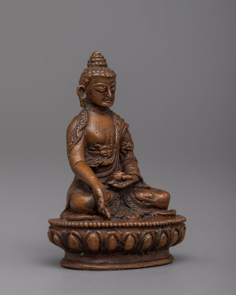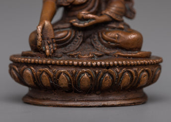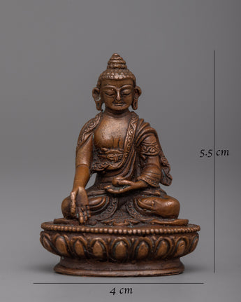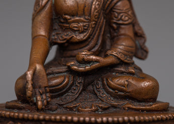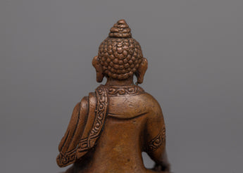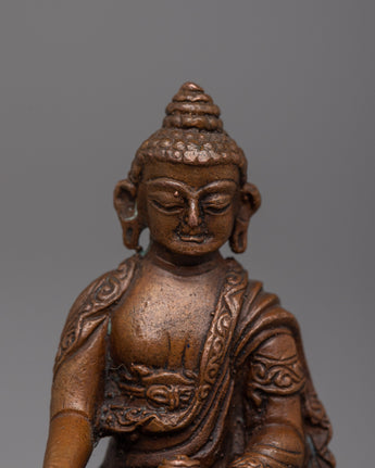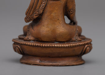 Immerse yourself in the heavenly light of the Tibetan Ratnasambhava Buddha Statue. Machine Molded with careful perfection on an oxidized copper body, this spiritual sculpture stands 5.5cm tall and exudes a sense of profound compassion and richness.