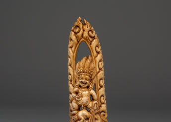 Discover the profound spiritual essence of the Tibetan Wooden Bone Ritual Figurine, which is painstakingly hand-carved from sustainably sourced yak bone and stands on a wood foundation. This ceremonial statue, standing 15.5cm tall and 5cm wide, exemplifies traditional Tibetan craftsmanship and sacred symbolism. This item, which is used in Buddhist rituals and meditation practices, acts as a potent guardian and spiritual tool, imbuing your altar or holy area with true Himalayan energy.