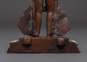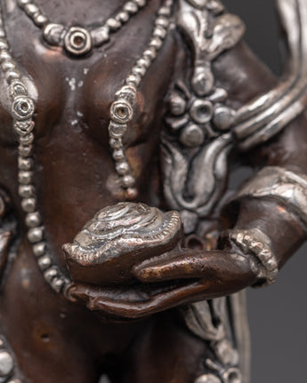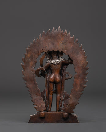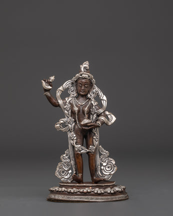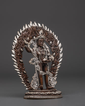 This statue is masterfully created with oxidized copper and silver-plated details, creating a stunning two-tone contrast showcasing her regal decorations and the fiery nimbus surrounding her. The statue, weighing 0.74kg, has a significant spiritual weight while staying compact enough for home altars or holy settings. The meticulous details, from her expressive posture to the flame halo, reflect traditional Himalayan metalwork artistry and spiritual regard.