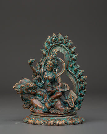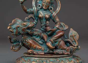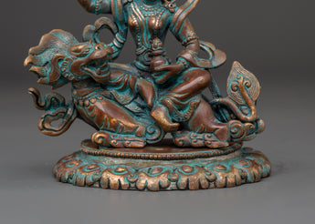 The statue is made of copper and has intricate detailing. The whirling scarf, burning aureole, and majestic snow lion all depict dynamic movement. The copper finish heightens the impression of hallowed history and spiritual depth. This Tseringma copper statue, a Tibetan long-life deity idol, and a Buddhist guardian sculpture are ideal for individuals seeking longevity, protection, and empowerment. It adds fierce feminine energy and blessings to your holy area.