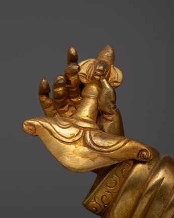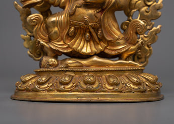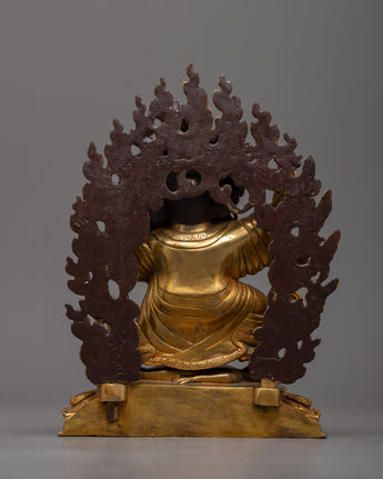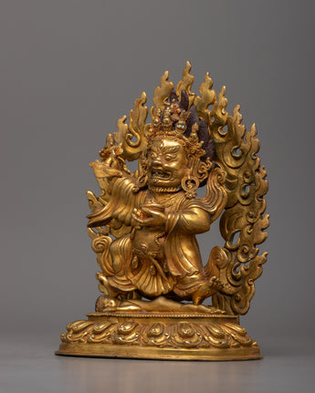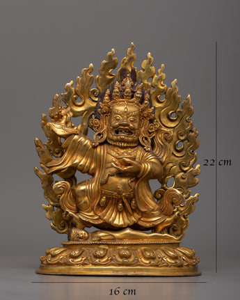 The Two-Armed Bernagchen Mahakala Dharma Protector statue captures the strong yet sympathetic aura of this respected Tibetan Buddhist deity. Crafted precisely by hand on a copper body and embellished with 24k gold plating, this statue reaches 22cm tall, making it a stunning and powerful presence in any spiritual or holy setting.