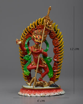 Experience the tremendous grace and spiritual force of the Lion-Face Dakini Singhamukha Statue. Machine made with perfection on a copper body and enhanced with vivid colors, this spiritual masterpiece stands 12 cm tall and 6 cm wide, weighing only 0.17 kilogram.