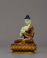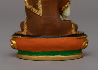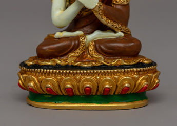 Our Vairocana Buddha Figurine, 8 cm tall and 6 cm wide, is a beautifully created Buddhist statue of copper, embellished with gold plating and hand-painted with acrylic. This intricately detailed miniature weighs 0.18 kg and is intended for spiritual practitioners, meditation altars, and sacred areas. Copper, venerated in Buddhist traditions, is thought to improve the flow of spiritual energy, whereas gold plating represents purity, knowledge, and the glory of enlightenment. This Tibetan Buddhist statue is a potent emblem of heavenly light that helps devotees achieve clarity, spiritual development, and cosmic consciousness.