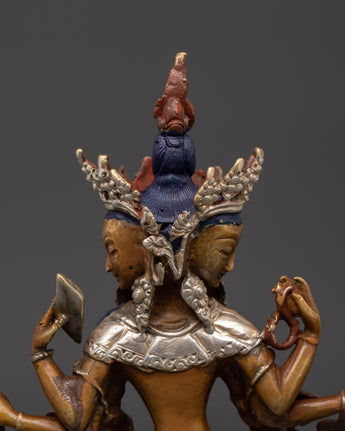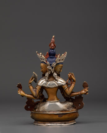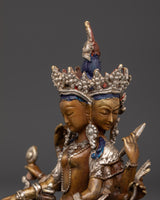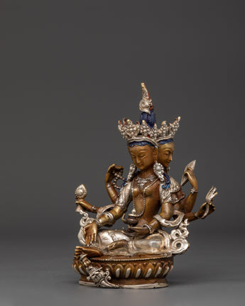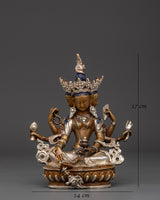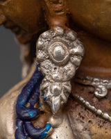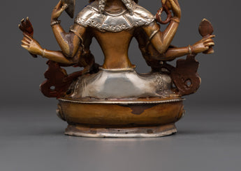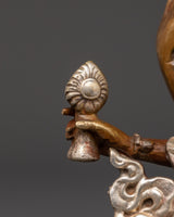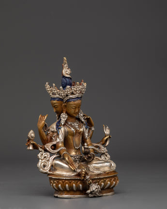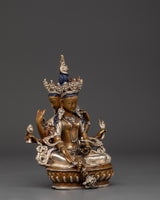 This Vasudhara goddess statue is 17 cm tall and weighs 0.83 kg, making it ideal for placing on an altar or as a centerpiece in your house. This statue, expertly sculpted by Himalayan artists, is constructed of oxidized copper and silver plating, creating a sculpture that blends excellent workmanship with spiritual meaning.