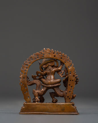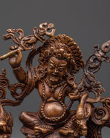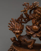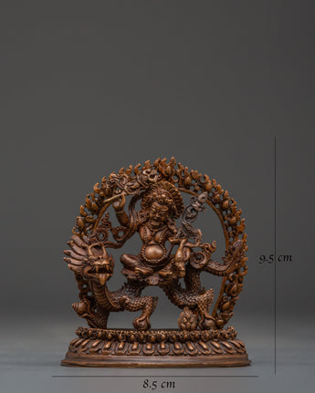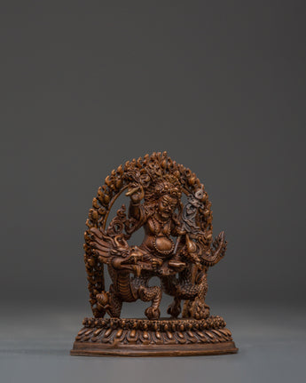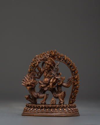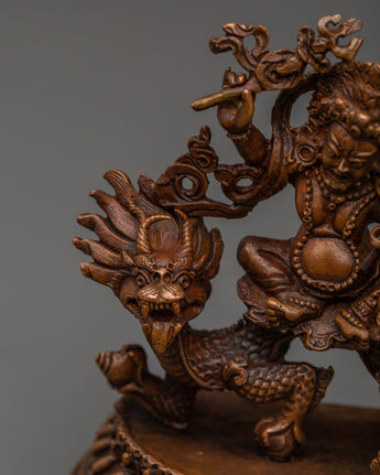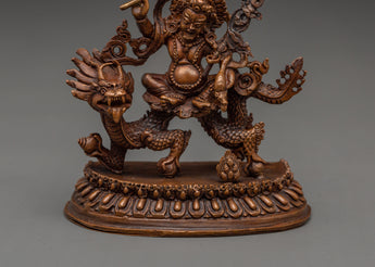 This Tibetan Dzambala monument, handcrafted by expert artisans, is adorned with a wealth of symbolic intricacy. The oxidized copper finish lends it a vintage appearance, enhancing its visual and dynamic appeal. Dzambala, the Buddhist wealth deity, is frequently invoked in pujas and meditations to remove financial impediments and promote generosity. Whether used in holy rituals or as a meaningful decorative element, this White Dzambala spiritual statue connects your space to the energies of wealth, success, and compassionate abundance.