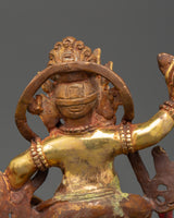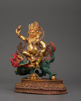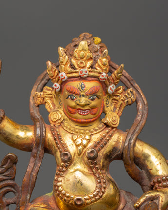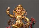 This White Dzambhala Sculpture depicts the deity of prosperity and abundance. Standing 19.5 cm tall and 16 cm wide, it symbolizes wealth and abundance in your home or spiritual place. This statue, weighing 1.54 kg, is made of oxidized copper, plated in gold, and enhanced with acrylic colors, giving it a classic and beautiful appearance. Dzambhala, a popular person in Tibetan Buddhism, is known for delivering prosperity, good fortune, and blessings to people who seek his help.