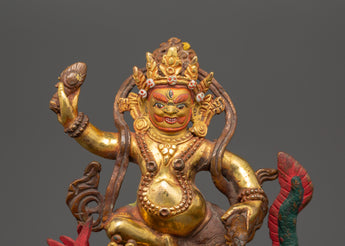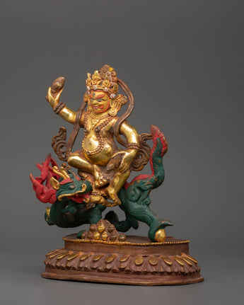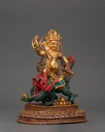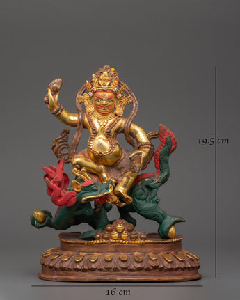 White Dzambhala is depicted in his royal form, seated on a dragon and holding a mongoose that spits out precious gems, in his left hand, symbolizing his ability to grant fortune and eliminate financial obstacles. The dragon beneath him represents protection, strength, and the power to overcome challenges. This intricately sculpted statue embodies the union of wealth, spiritual power, and protection, making it a coveted item for followers seeking both material and spiritual prosperity.