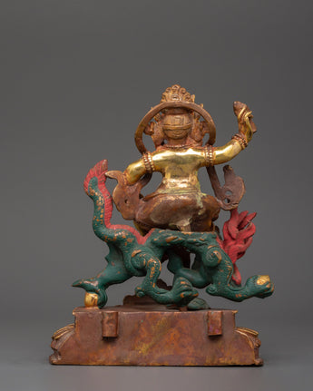 White Dzambhala is depicted in his royal form, seated on a dragon and holding a mongoose that spits out precious gems, in his left hand, symbolizing his ability to grant fortune and eliminate financial obstacles. The dragon beneath him represents protection, strength, and the power to overcome challenges. This intricately sculpted statue embodies the union of wealth, spiritual power, and security, making it a coveted item for followers seeking both material and spiritual prosperity.