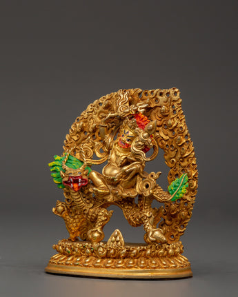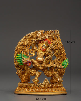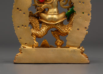 This finely carved White Dzambhala Statue is 11.5 cm tall and weighs 0.36 kilograms. It's made of copper and gold-plated, with delicate embellishments like brilliant acrylic color accents. White Dzambhala is represented in his royal form, sitting atop a dragon and holding a mongoose in his left hand. The dragon underneath him indicates power, protection, and the capacity to overcome obstacles, while the mongoose denotes abundance of money and the ability to create success. This potent mix of symbols strikes an ideal balance between material prosperity and spiritual growth.