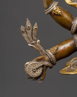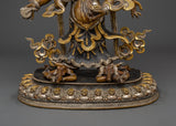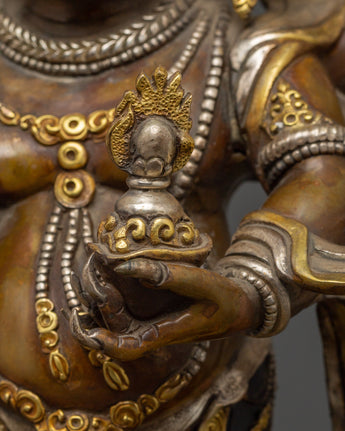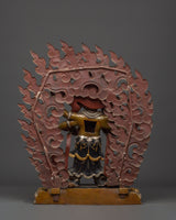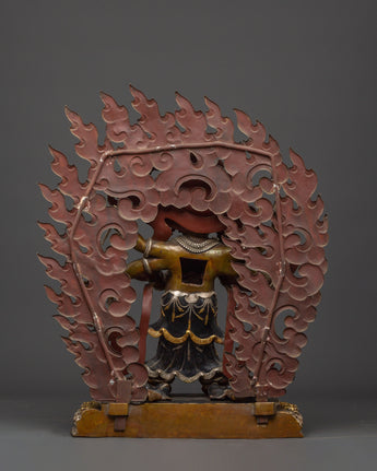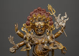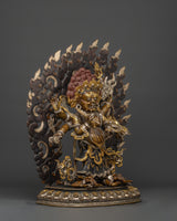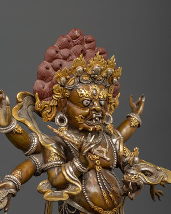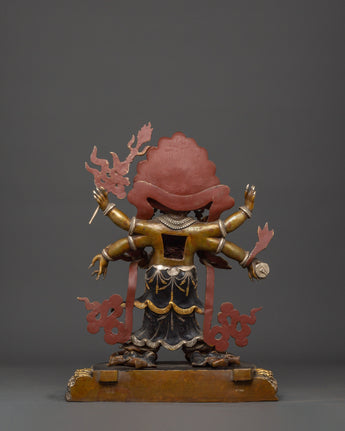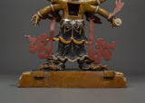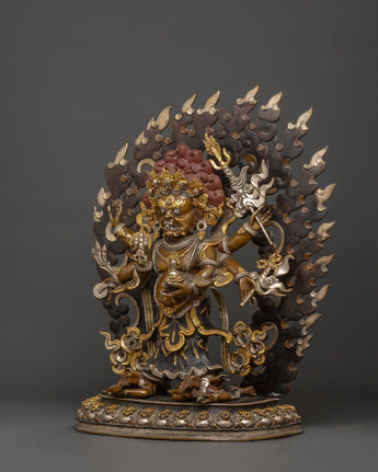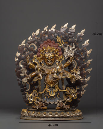 This statue is expertly carved from oxidized copper with silver plating, and every detail showcases authentic Himalayan craftsmanship. The swirling flames behind him indicate transformation and spiritual purification, while the deity's numerous arms carry ceremonial artifacts that represent his divine powers. The skull crown, rich jewelry, and strong demeanor emphasize his role as both a spiritual guardian and a remover of obstacles. This statue is perfect for use in home altars, temples, or as a significant piece of meditation decor with cultural and philosophical meaning.