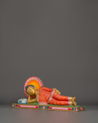 This particular posture in the Buddha's life appears to have originated at the same time as the other Buddha symbols and images, most notably in the Greek-influenced Gandharan period Buddhist arts. Many other regions have followed it in their Buddhist art to represent one of the pivotal moments in the Buddha's life. In Buddhism, this stance of the Buddha is known as the mahaparinirvanasana. When the Buddha realized his death was coming while in this position, he requested his students to create a couch in a bush to make it easier for him to lie down.