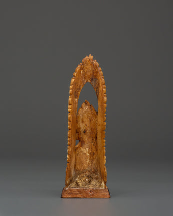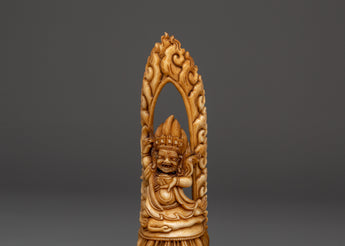 Discover the powerful energy and spiritual essence of the Yak Bone Sculpture, a stunning example of traditional Tibetan artistry. The finely carved sculpture, measuring 13.5 cm in height and 4.5 cm in breadth, represents the protective force of a Buddhist guardian deity. Handcrafted from Yak Bone and a Wooden Base, this sculpture weighs around 0.052 kg and is lightweight and artistically powerful. The delicate features and traditional artistry represent the dedication of talented Tibetan artists who carefully carve each item to maintain the deity's cultural and spiritual value. This sculpture, portraying the transformation of negative energy into protective blessings, is ideal for beautifying meditation rooms, personal altars, or holy nooks.