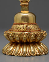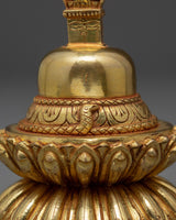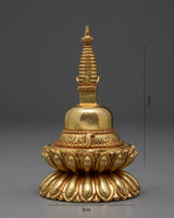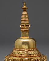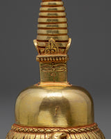The stupa is a handmade Buddhist shrine finely detailed, which is completely gold-plated. The stupa has beautiful lotus designs on the bottom which symbolize purity of the body, speech, and mind. The top has a perfectly designed thirteen umbrella wheels and other carvings in a similar manner.