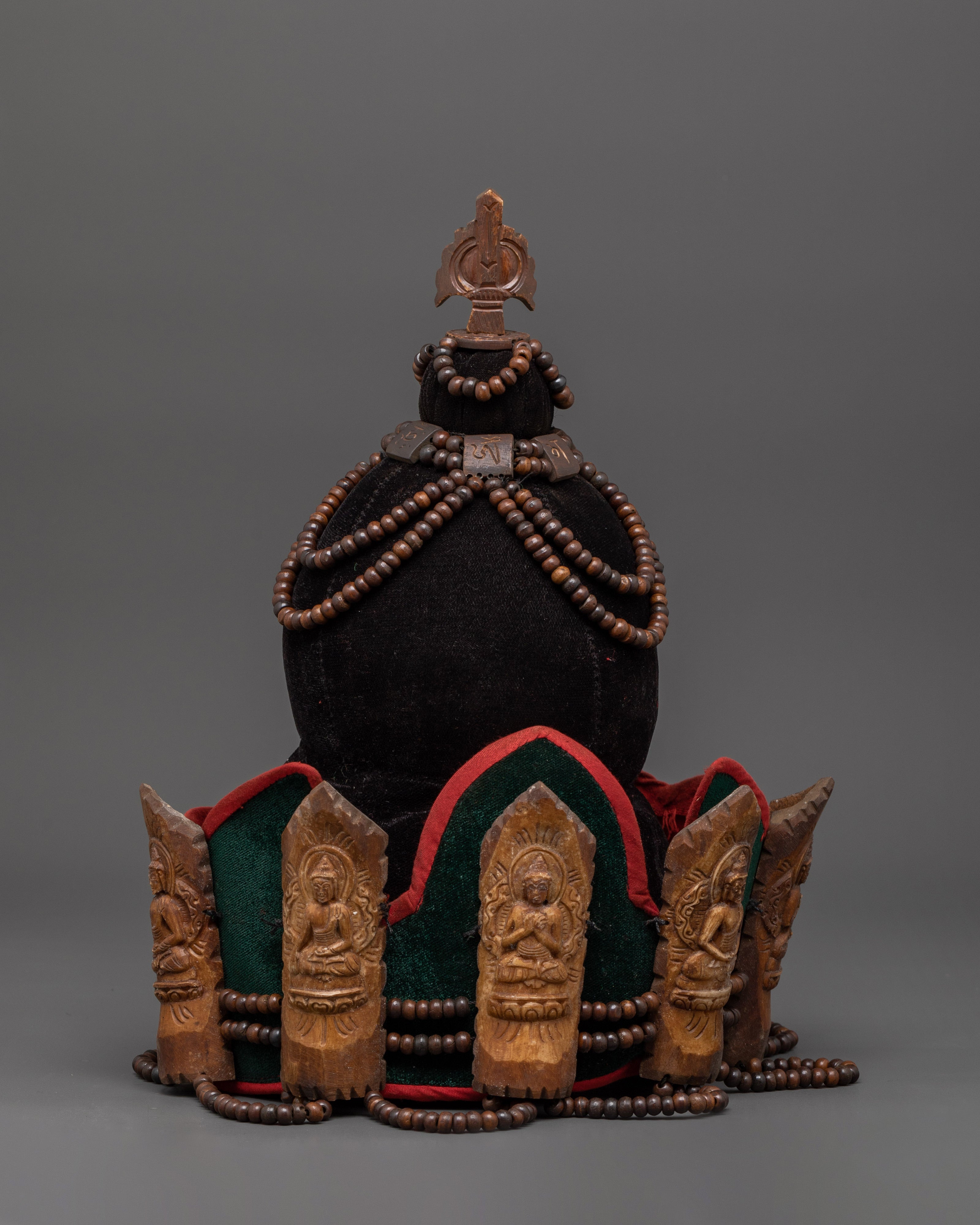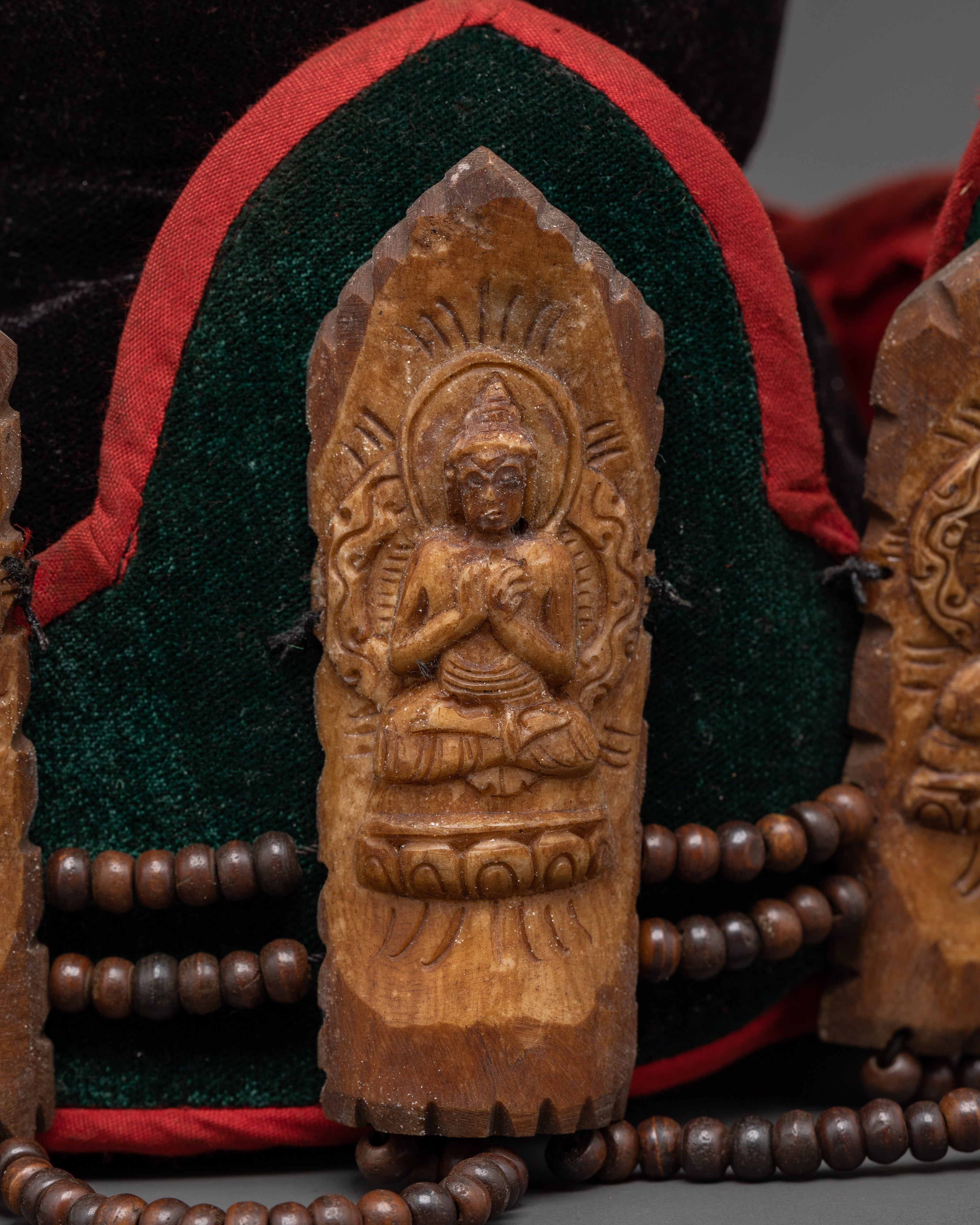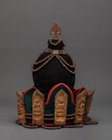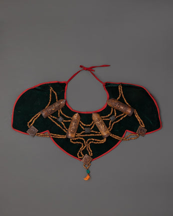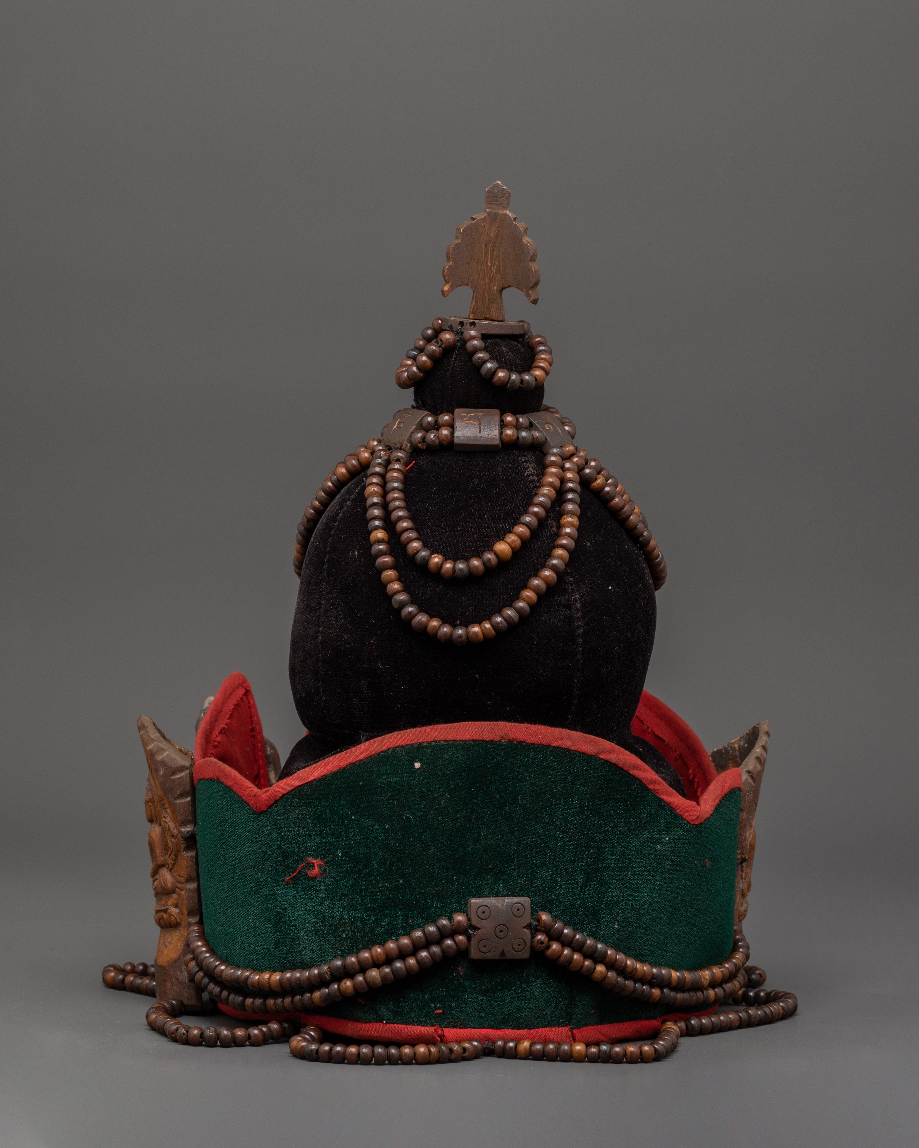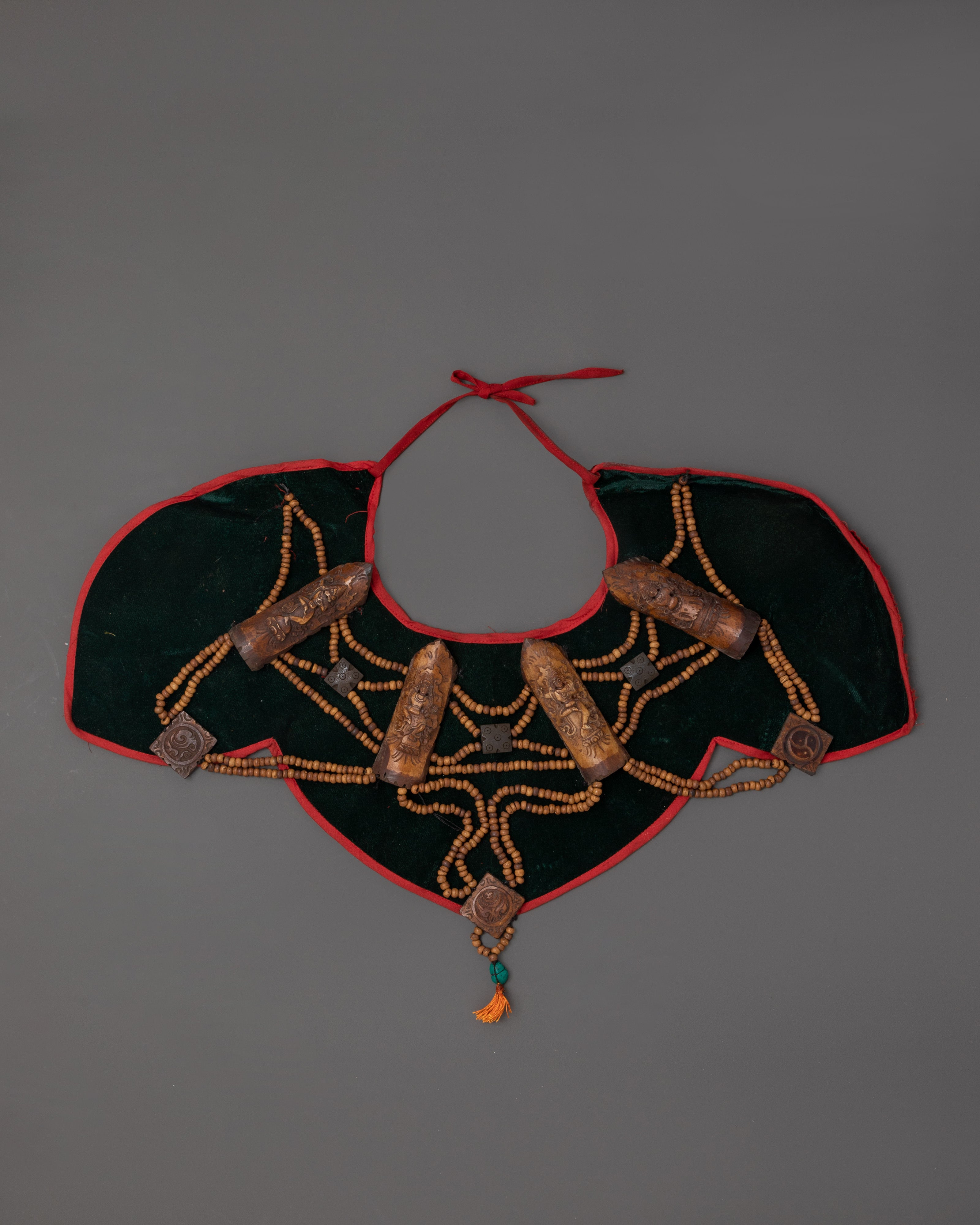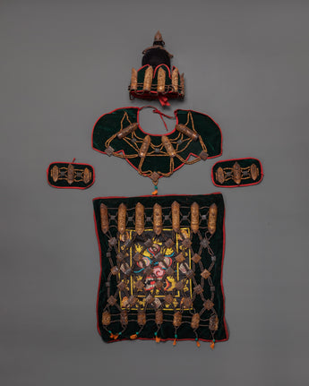 Each component in the set is meticulously crafted to represent powerful symbols from Tibetan and Buddhist traditions. The crown (32.5 cm high and 20.5 cm wide) symbolizes divine sovereignty and spiritual authority, enhancing the spiritual atmosphere of your home. The choker necklace (42 cm in height and 61 cm in width) and armlets (13 cm in height and 23.5 cm in width for each, with a total weight of 0.260 kg) bring a sense of protection and adornment to the wearer or the space in which they are displayed. The apron (70 cm high and 60 cm wide, weighing 1.76 kg) completes the set, symbolizing grounding, strength, and connection to the earth and the divine.