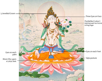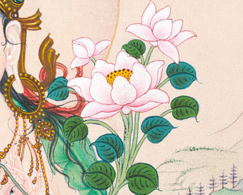 The practice of White Tara is performed to cure any health issues in the Buddhist Community. It is the dedication of Prayer to Mother Tara for protecting us from sickness, accidents, and disease. In the thangka, Tara is placed at the center, visibly making stand out in her radiating white body. She holds a fully bloomed lotus with her left hand and her right-hand touches her lap with a hand mudra. It is indeed a marvelous collection from us. We take happiness in making it available to you all.