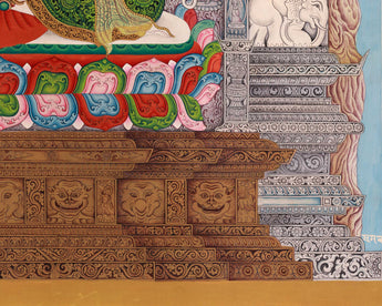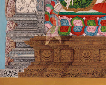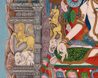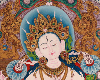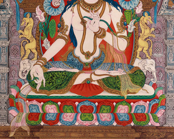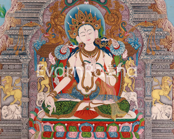 The Mother of Liberation Thangka Print portrays the revered deity White Tara, an embodiment of compassion, wisdom, and healing within Tibetan Buddhism. White Tara is depicted in a serene posture, seated gracefully upon a lotus throne, with eyes full of compassion and love. Her seven eyes symbolize her ability to perceive the suffering of sentient beings and her readiness to come to their aid. With one hand in a gesture of granting boons and the other in a gesture of fearlessness, White Tara offers solace and protection to her devotees, guiding them through the challenges of life towards spiritual liberation. Adorned with sacred ornaments and surrounded by an aura of divine light, she emanates a sense of peace and tranquility, inspiring practitioners to cultivate compassion and wisdom in their own lives. The Mother of Liberation Thangka Print serves as a powerful visual reminder of White Tara's boundless compassion and her unwavering commitment to the welfare of all beings, offering blessings of healing, protection, and spiritual liberation.