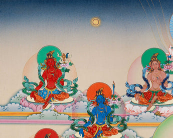 The Twenty One Tara Thangka Print represents a sacred ensemble of the twenty-one manifestations of Tara, the revered Buddhist deity known for her compassion and swift assistance to those in need. Each Tara emanates a unique aspect of compassion, wisdom, and protection, offering devotees a diverse array of blessings and guidance. Crafted with meticulous detail and vibrant colors, this Thangka print captures the grace and power of each Tara, surrounded by symbolic motifs and mandalas. From the peaceful White Tara to the fierce Black Tara, each manifestation embodies the compassionate embrace of the divine feminine, inspiring practitioners on their spiritual journey towards enlightenment and liberation. Displayed in homes, meditation spaces, or temples, this Thangka print serves as a potent reminder of Tara's unwavering support and the boundless potential for compassion and wisdom within all beings.