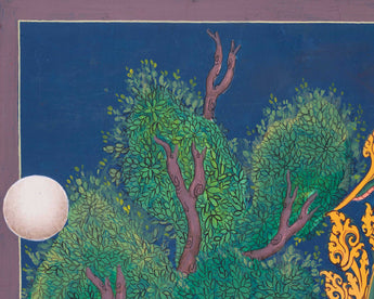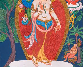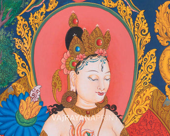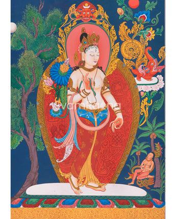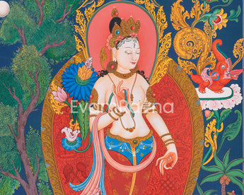 The White Tara, a celestial representation of peace and compassion in Tibetan Buddhism, lends a sense of divine tranquility to this lovely print. White Tara is an ethereal figure that exudes a sublime elegance and represents enlightened wisdom and purity. Her seven eyes—which are located on her forehead, palms, and soles—stand for her capacity to recognize and show compassion for the suffering that all living things endure. White Tara is seated in a graceful pose with her left hand holding a blue lotus, a symbol of purity and enlightenment, and her right hand outstretched in the gesture of granting wishes (varada mudra). The print's fine details encapsulate the goddess's protective nature as well as her promise of comfort and direction. This White Tara print is ideal for meditation nooks and sacred areas because it brings a sense of calm and spirituality into your house and acts as a visual tribute to enlightenment and compassion.