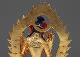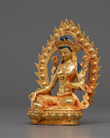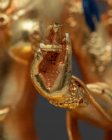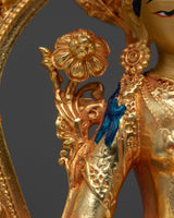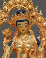 The divine grace of our Female Bodhisattva Green Tara Statue, a fusion of spiritual symbolism and modern craftsmanship, is revealed. Its copper body is machine-made for precision and adorned with a luxurious electro-gold plate, creating a mesmerizing blend of tradition and contemporary artistry.