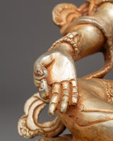 A closer glance reveals the delicate workmanship that makes this statue come to life. The gold-plated surface highlights Tara's tranquil demeanor, flowing robe, and subtle hand mudras. Every detail, from the folds of her robes to the lotus petals that support her, has symbolic value related to wisdom, purity, and enlightened action. The turquoise and coral stones provide Himalayan character and cultural richness, evoking traditional Buddhist aesthetics. The mix of copper craftsmanship and gold accents produces a strong visual presence that encourages meditation, dedication, and inner quiet, making it an important addition to both personal and ceremonial areas.