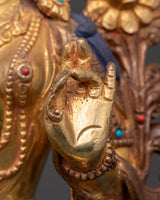 Green Tara, revered as the Swift Liberator and embodiment of compassionate activity (karuṇā in action), is iconographically portrayed seated with elegance upon a blooming lotus throne. Her right leg is extended forward, symbolizing her readiness to respond instantly to the suffering of sentient beings. In both hands, she holds fully blossomed lotus flowers, representing spiritual awakening and the purity that arises unsullied from the mire of samsara. Her right hand extends downward in the Varada Mudra, the gesture of supreme generosity, bestowing blessings and protection. Her left hand forms the Three Jewel Mudra, symbolizing her reverence for the Buddha, Dharma, and Sanghathe foundational refuges of the Buddhist path. Adorned with a crown featuring the Five Dhyani Buddhas, Green Tara embodies the quintessence of enlightened wisdom (prajñā) in its fivefold expressions, revealing her luminous insight and vigilant guardianship. Her resplendent green hue evokes vitality, renewal, and a nurturing connection with the natural world. This vibrant color also conveys her healing energy and swift compassion. Radiating calm strength and unwavering dedication, Green Tara's sacred presence inspires confidence, offering solace and guidance on the path toward liberation.