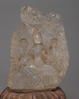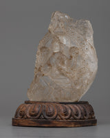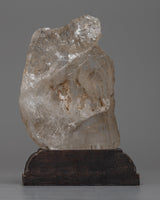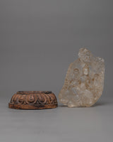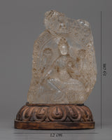 This statue, which stands on a carefully crafted wooden base, combines the warm strength of wood with the ethereal beauty of crystal. This harmonious combination of materials represents the harmony of nature and enlightenment, grounding Green Tara's ethereal qualities in the physical world.