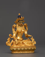This Divine White Tara statue is a stunning representation of the Tibetan Goddess of Compassion. This statue, handcrafted from copper and finished with radiant gold plating, depicts White Tara seated on a lotus moon disc in a serene attitude. It is the ideal addition to your sacred shrine or meditation area because of the exquisite craftsmanship that highlights her calm and caring presence. This small yet powerful statue, measuring 10 cm in height and 8.5 cm in width, looks excellent in any spiritual setting and raises the vibrations in your space.