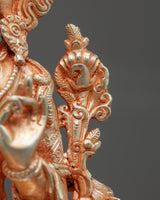 The Green Tara Gold statue has been expertly hand-carved in the traditional Himalayan manner. The statue was made with a copper body and then plated with genuine gold, highlighting the exquisite design patterns. She can be seen making the "Prithvi Mudra" with her right hand and the "Generosity Mudra" with her left.
