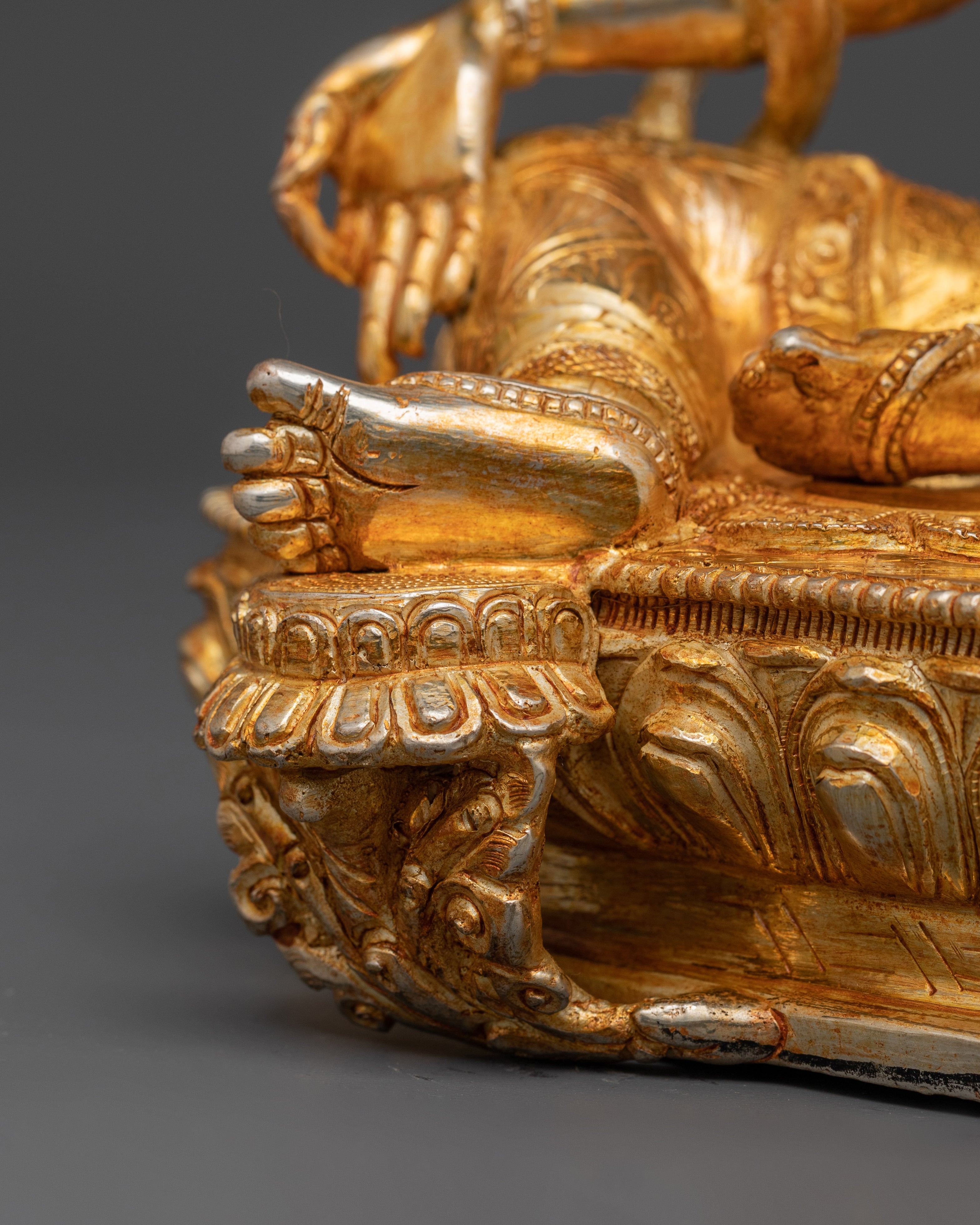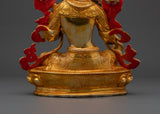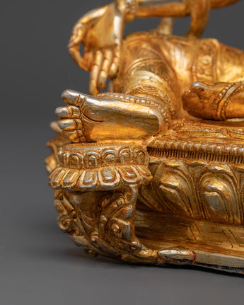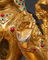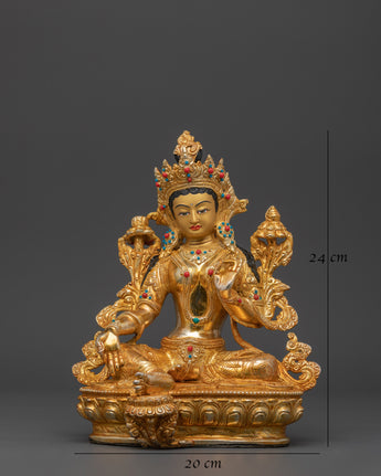 Green Tara, the revered Goddess Protector from suffering and obstacles, is beautifully represented in a carved statue. The piece, which stands 24 cm tall and has a base width of 20 cm, depicts Tara, who is recognized for taking quick action to help beings overcome fear and pain. This statue is composed of copper with gold plating. The craftsmanship reflects Green Tara's sacred presence, filling your area with spiritual protection and peace.
