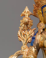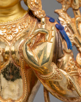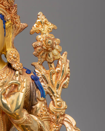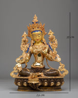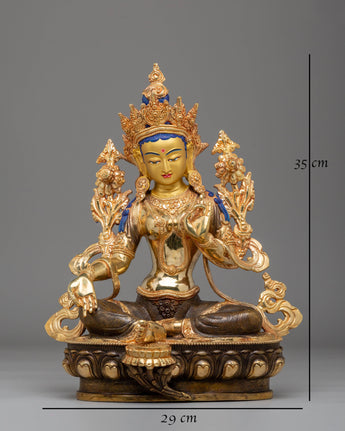 This Green Tara Handmade Copper Statue is a radiant and powerful representation of compassion, grace, and protection. Standing at 35cm (Height) and 29cm (Width), with a weight of 4.15 kg, it is beautifully crafted using 24K gold plating, acrylic colors, and a copper body. Green Tara, known as the compassionate goddess who offers protection from fear and obstacles, is depicted in a seated position, her right leg extended in a gesture of readiness to assist all beings in need. Her serene expression and poised hand gestures, symbolizing refuge and compassion, make this statue an extraordinary addition to any altar, meditation room, or sacred space.
