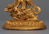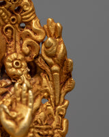 This exquisite statue of Green Tara, painstakingly machine-made on a copper body and exquisitely painted in 24k gold, invites you to embrace her healing energy. This statue, which stands gracefully at 12.5 cm in height and 9.5 cm in width, is full of spiritual power and beauty. It adds a significant and weighty presence to any religious area at 0.55 kg.
