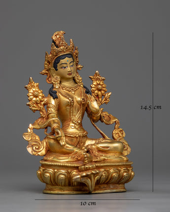 Presenting the Green Tara Small Gold Gilded Statue, a representation of loving defense and prompt assistance in times of need. This finely carved statue, which measures 14.5 cm (5.7 inches) in height and 10 cm (3.9 inches) at the base, is ideal for personal altars, meditation areas, or as a thoughtful gift.
