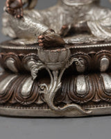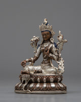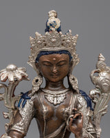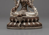 The Nepalese Green Tara Statue is a striking representation of kindness and defense. This statue is machine-made on an oxidized copper body and completed with electro-silver plating. It is crafted with great attention to detail. Measuring 10.5 cm in height, it displays the elegant figure of Green Tara, a highly esteemed deity in Tibetan Buddhism who is renowned for her prompt action in easing suffering and fulfilling requests.
