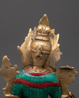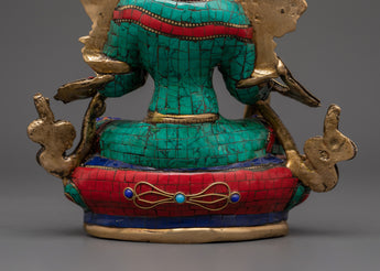 This brass Green Tara statue features Tara in her iconic pose, exuding serenity and compassion. Her right hand is raised in a gesture of protection, while her left hand is poised in a gesture of blessing. The use of turquoise symbolizes healing, vitality, and peace, while the coral stones represent strength, protection, and positive energy. The brass material gives the statue a timeless quality, enhancing its presence in any room with both spiritual and visual appeal.
