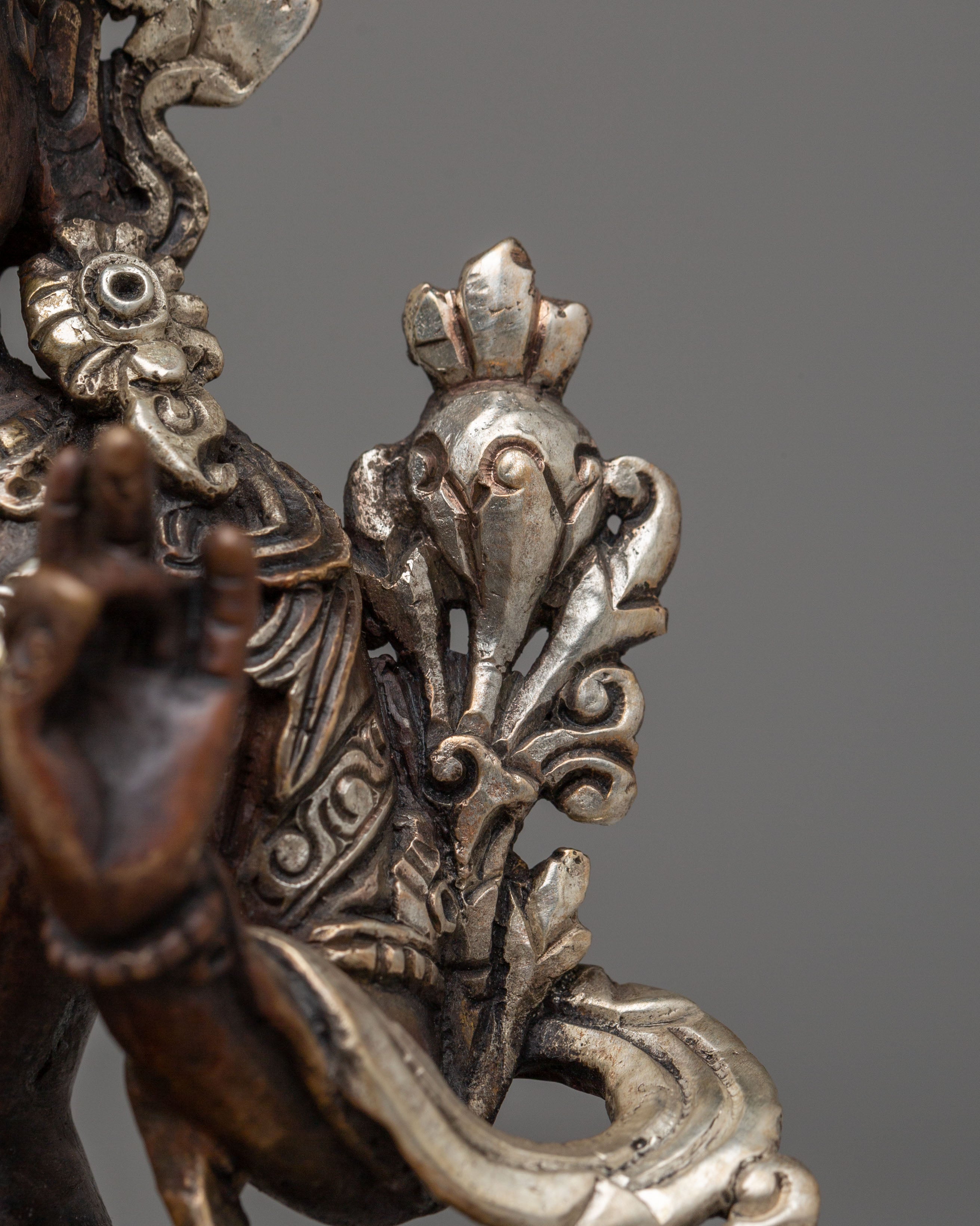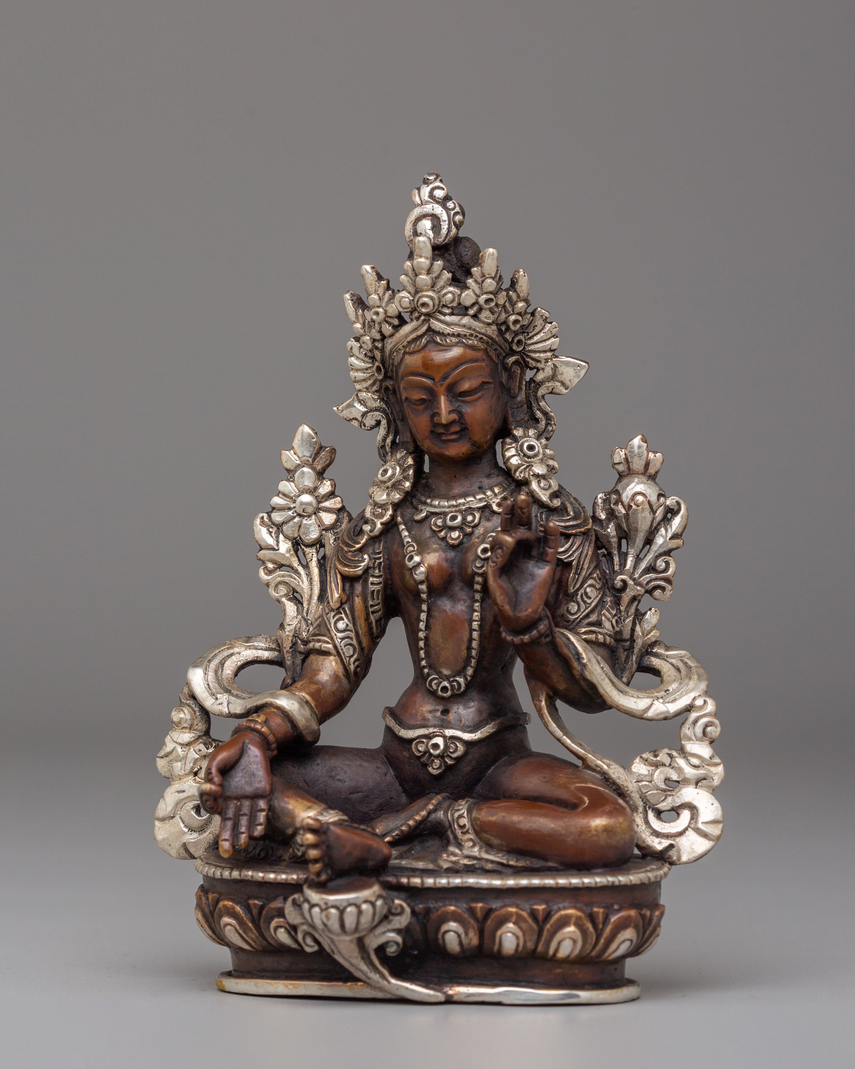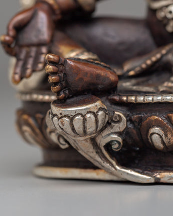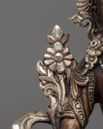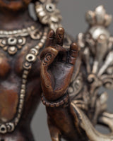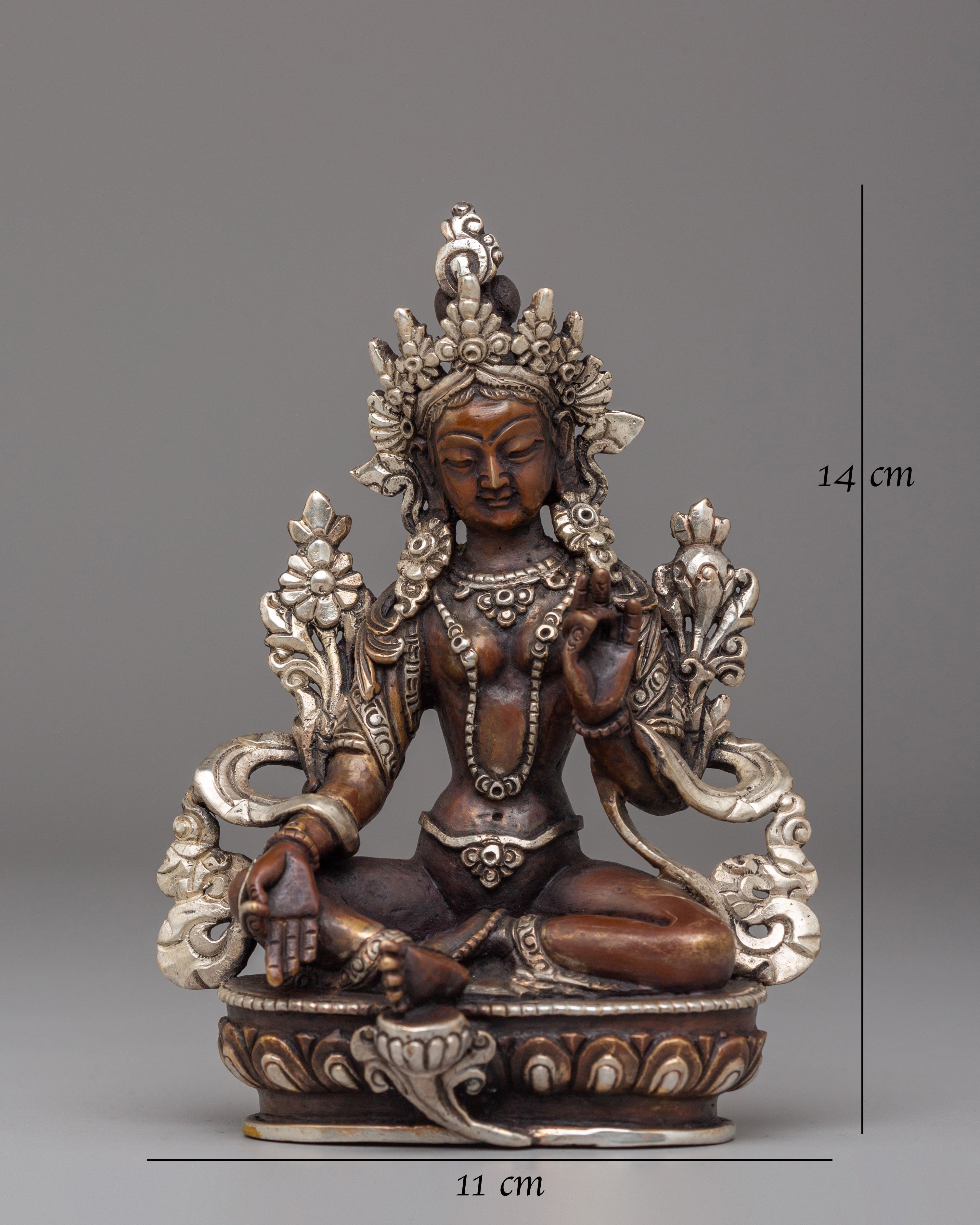 This Handcrafted Shyama Tara Statue embodies Green Tara, the revered goddess of compassion, protection, and swift action in Tibetan Buddhism. Crafted from oxidized copper with electro-silver plating, this exquisite statue radiates divine grace and spiritual energy. Measuring 14 cm tall and 11 cm wide, it serves as a perfect addition to any sacred space, altar, or meditation area, offering blessings of peace, healing, and guidance to those who seek her presence.