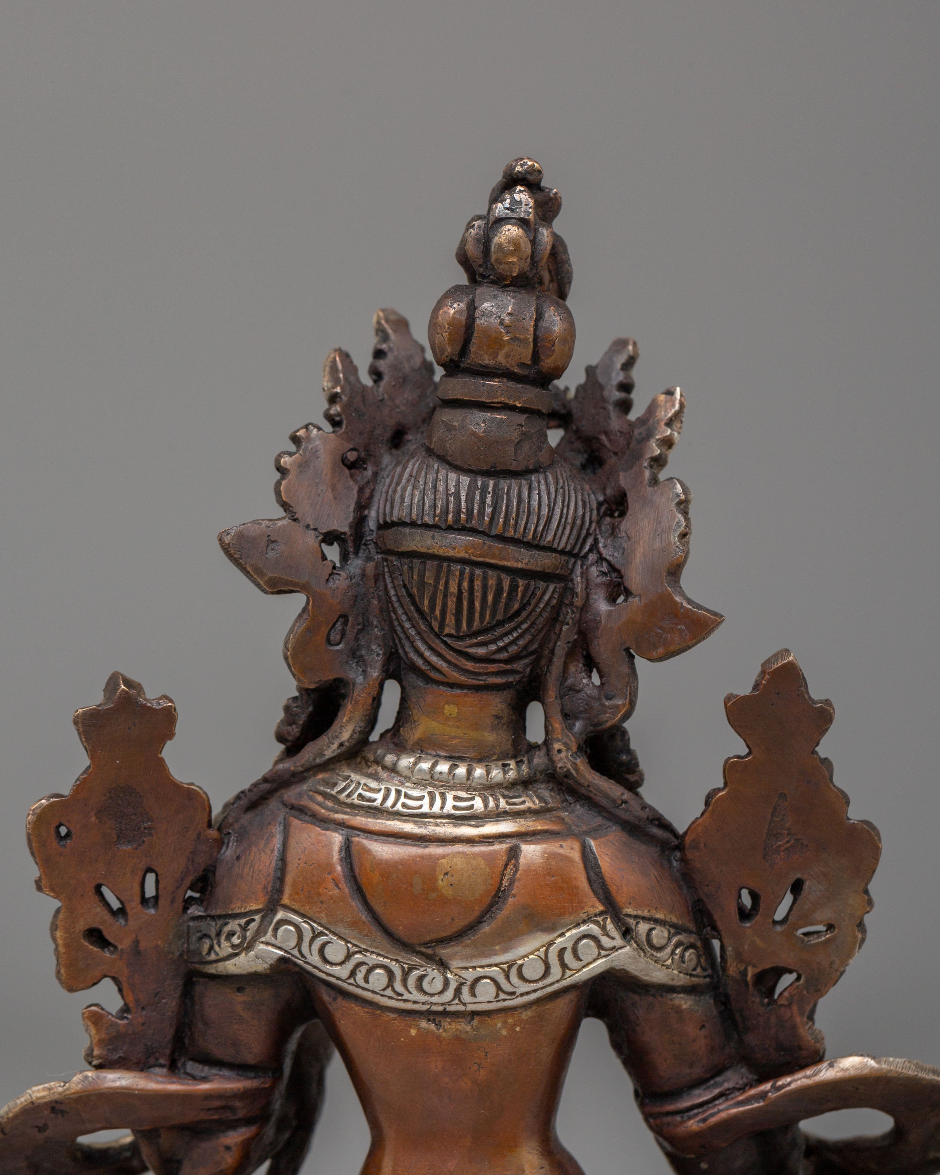 Green Tara is a highly regarded deity in Tibetan Buddhism. She represents protection and enlightenment, encouraging followers to practice compassion and overcome challenges on their spiritual journey. Placed on an altar or shown in a hallowed area, this handcrafted monument is a sacred symbol of celestial direction and blessing. Seated gracefully, her right leg extended, she emanates tranquility and readiness to aid those in need. She holds a lotus flower in her right hand, symbolizing purity and spiritual awakening. Her left hand performs the Three Jewel Mudra, representing the Buddha, Dharma, and Sangha, while holding a lotus to signify spiritual growth. Adorned with a Five Dhyani Buddha crown, she embodies the five aspects of enlightened wisdom.
