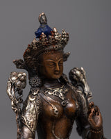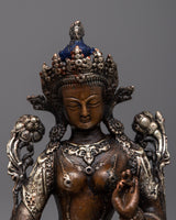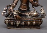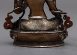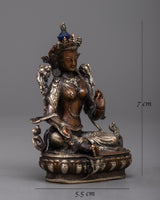 Introducing the Buddhist Machine Made Green Tara Statue, a powerful representation of emancipation and active compassion. Crafted on a copper body and delicately finished with silver plating, this 7cm tall statue captures the essence of Green Tara's protective and sympathetic character.