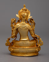 The Machine-made Green Tara Statue, standing at a modest height of 7 cm, represents Green Tara's loving and caring traits as the embodiment of enlightened activity. This statue, expertly crafted from copper using advanced machine techniques, represents the graceful and calm essence of the Green Tara symbol. Its shiny 24k gold plating creates an aura of divine energy and spiritual empowerment.