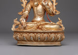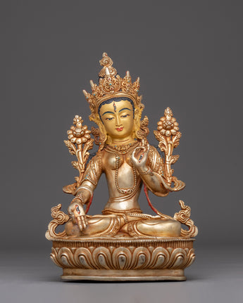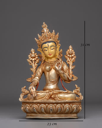 This Meditation Goddess White Tara Statue depicts the Buddhist goddess's tranquil grace and compassion, which represent healing, purity, and longevity. The statue is handcrafted from copper and has a bright gold-plated finish. It is carefully embellished with imitation turquoise and coral stones, which add to its spiritual beauty and symbolic significance. This sculpture, which stands 31cm tall and 23cm wide and weighs 3.54kg, is a strong emblem of serenity and divine feminine energy, exuding tranquility and spiritual harmony in any holy area.