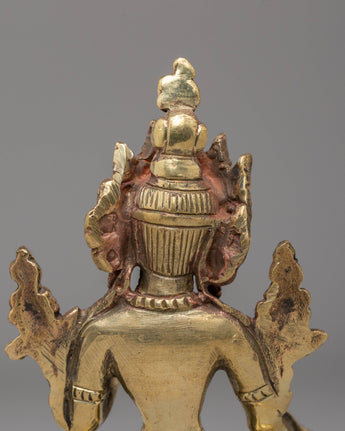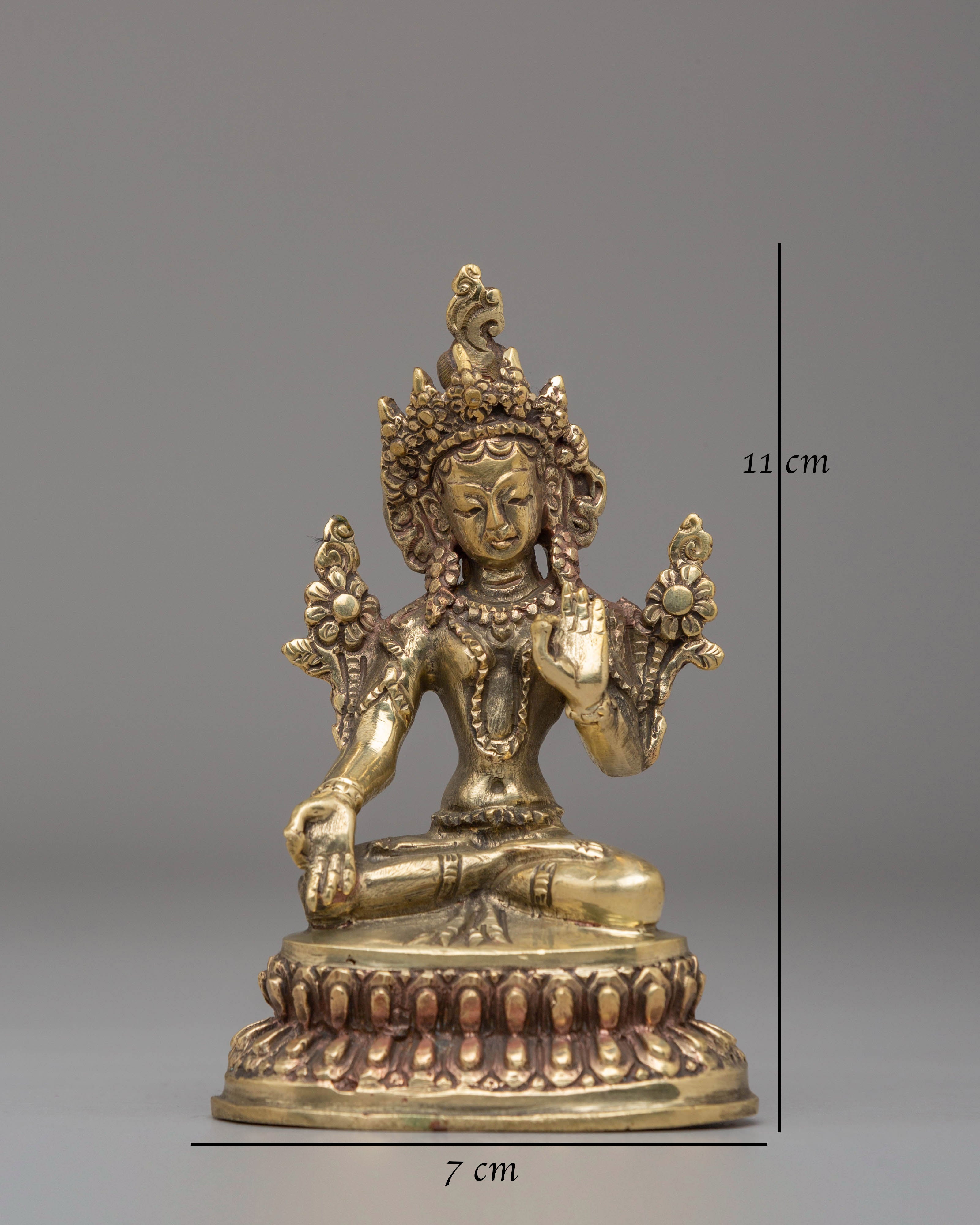 This Sacred White Tara Buddhist Statue is a serene and powerful representation of White Tara, the goddess of compassion, healing, and longevity. Standing at 11cm in height and 7cm in width, this statue is made from copper, radiating a peaceful, protective energy that enhances any altar or meditation space. White Tara is depicted in a calm and compassionate posture, symbolizing her deep ability to heal suffering and bring long-lasting peace and protection to those who seek her blessings.