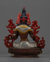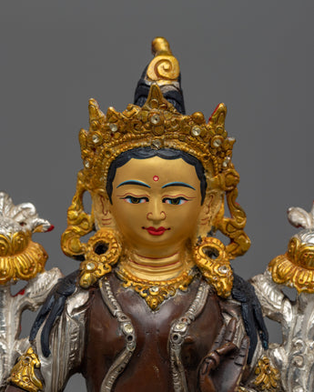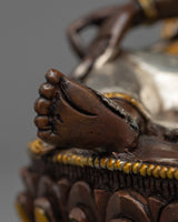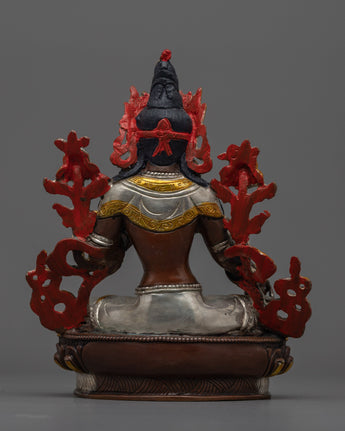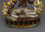 Green Tara is depicted seated in her typical pose, one leg outstretched, indicating her willingness to provide instant aid to anyone in need. Her right hand is in the varada mudra, symbolizing her limitless giving, while her left hand is holding the utpala lotus, a sign of purity and spiritual enlightenment. The oxidized copper body, embellished with silver and gold, adds depth and contrast to her celestial form, making this statue a visual and spiritual focal point for those seeking Green Tara's protection and guidance.
